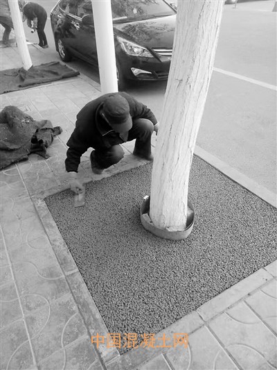 記者在現場看到,有工人正在給樹窩填埋一種紅色物質,并將樹窩抹平。負責該項工程的蘭州華德眾仕電子科技公司一程姓工作人員稱,這種混凝土叫生態透水混凝土,俗稱無沙混凝土,混凝土顆粒之間有細小的縫隙,具有吸水功能,雨水可通過這種混凝土縫隙滲入地下,從而保證樹木能吸收到需要的水分,十分環保。