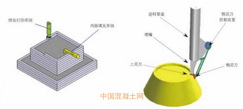 之前荷蘭的一家建筑企業也已著手進行一棟大樓的打印,其施工主要是通過將3D打印機打印出來的預制件像積木一樣壘起來,以此來完成打印。在3D打印混凝土的打印過程中,是混凝土條層層堆積的過程,不可避免地會在打印構件的表面上出現臺階效應,其表面粗糙不平,不僅影響美觀,還可能導致精度的誤差,從圖6中可以明顯看出,打印的構件表面存在橫向的條紋,層次較為明顯,表面平整度有待美化。而為了處理這類問題,通常使用兩種方法:一是縮小打印噴嘴的口徑,降低臺階的高度,這種方法會降低打印的速度,影響施工效率,同時并不能保證表面達到理想的平整度;二是在成型后進行后續抹平處理,此方法需進行重復工作,費時費力。為解決3D打印建筑施工過程中的這些問題,美國南加州大學的BehrokhKhoshnevis教授提出輪廓建筑工藝(ContourCrafting)。輪廓建筑工藝是使用3D打印技術進行建筑建造的一種工藝,包括輪廓打印系統(Extrusionsystem)和內部填充系統(Fillingsystem)兩部分(如圖7(左)所示),其原理是先進行外部輪廓的打印,之后向內部填充材料,形成混凝土構件。