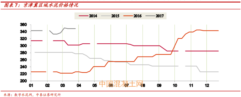從供給去化規劃的角度看,2016年河北省全年壓減水泥產能286萬噸,超額完成全年供給側改革150萬噸的規劃目標;根據規劃,河北省2017年底將把熟料產能控制在9000萬噸以內、規劃壓縮水泥產能6000萬噸。按照這一數據,區域內水泥的產能利用率將提升到60%以上。建立在當前區域內基本沒有新增產能的基礎上,我們認為2017年京津冀區域內的供給端壓力將持續降低。
