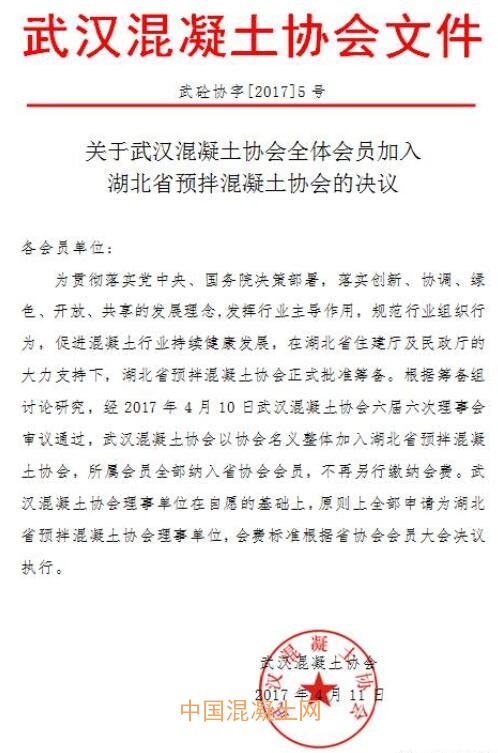 關于武漢混凝土協會全體會員加入湖北省預拌混凝土協會的決議全文如下:
