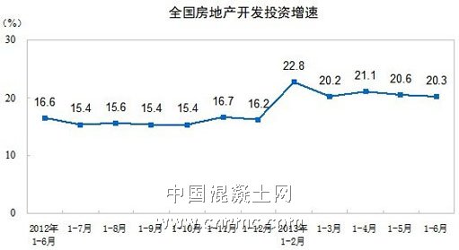 今年,城鎮(zhèn)化建設被放上了臺面,在水泥、混凝土及建設行業(yè)吹起了暖風。雖然直到目前,城鎮(zhèn)化規(guī)劃仍然沒有出臺,但是隨著這股“暖流”,基礎建設投資、房地產開發(fā)、保障房建設等都出現(xiàn)了不同程度的增長。而與之息息相關的混凝土行業(yè)也隨之上升。數(shù)據顯示,2013年1-6月份,全國房地產開發(fā)投資36828億元,同比名義增長20.3%(扣除價格因素實際增長20.3%),增速比1-5月份回落0.3個百分點。并且從下圖上來看,今年的1-2月是房地產投資增速大幅上升的主要區(qū)域。原因在于受長時間國家政策調控所致,房地產低位運行,庫存消化已經接近尾聲,加之房地產開發(fā)資金及時到位,剛性需求集中入市等因素影響,房地產投資才有了大幅度增長。在這一利好因素下,混凝土市場價格出現(xiàn)回穩(wěn),也是情理之中。