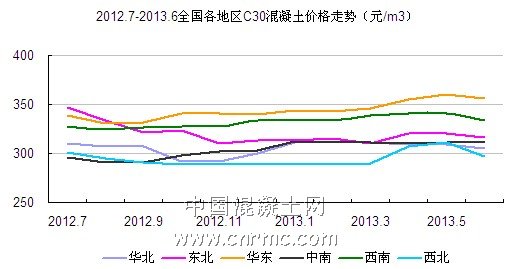 中南地區(qū):該地區(qū)混凝土價格自2012年下半年開始就一直處于上升態(tài)勢,直到2013年年初混凝土價格達到了313元/m3。不過遺憾的是,上升態(tài)勢并沒有繼續(xù)延續(xù)。原因主要是由于該地區(qū)水泥市場一直處于下滑態(tài)勢,到了2013年4月才探底維穩(wěn),價格在311元/噸。而受此影響,混凝土價格自然難有上升,截止于6月底,混凝土價格仍然維持在310元/m3。不過,據廣州混凝土行業(yè)協(xié)會7月份消息,第二季度過后,建筑市場慢慢恢復,對混凝土及其他建材材料需求回升,導致混凝土原材料價格不斷上升。在這個情況下,協(xié)會要求廣州地區(qū)對混凝土價格作出相應調整。由此看來,中南地區(qū)其他省市的混凝土價格或將有上漲可能。