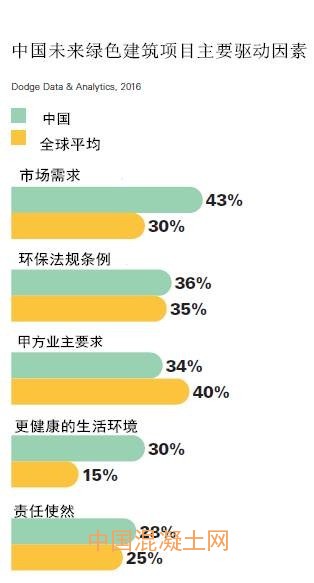 驅(qū)動:市場需求是中國未來綠色建筑項目最廣為認知的驅(qū)動因素。然而,除了市場本身的拉動性需求外,環(huán)保法規(guī)條例也是中國市場的一個關鍵推動力。中國市場的主要驅(qū)動因素跟全球市場的驅(qū)動因素間的區(qū)別在于兩者對更健康生活環(huán)境的重要性的認知。在中國,認為生活環(huán)境健康更重要的中國被訪企業(yè)高達30%,而這一數(shù)字的全球平均數(shù)只有15%。