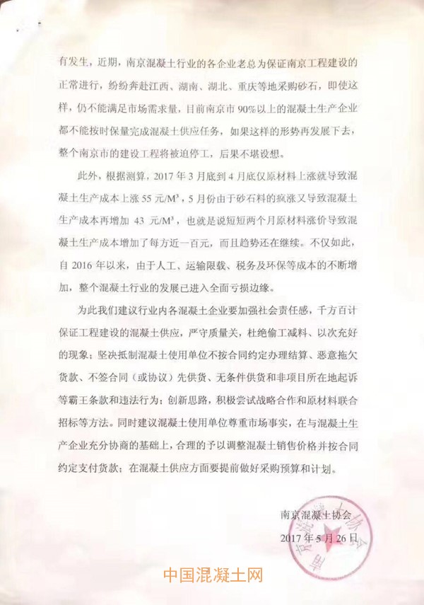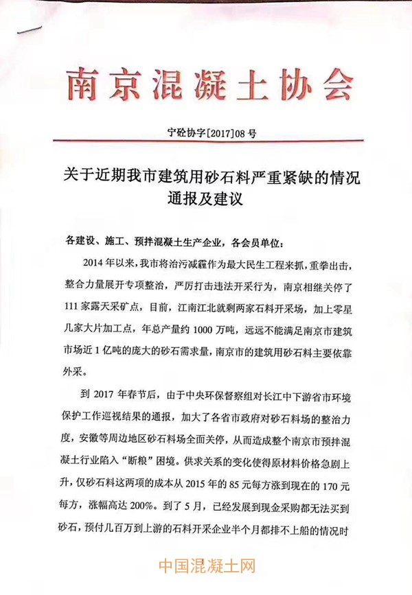 5月26日,南京混凝土協會關于近期南京市建筑用砂石料嚴重緊缺的情況發布通報及建議。公告中提到:目前江南江北僅剩的兩家石料開采場遠遠不能滿足南京市建筑市場近1億噸的砂石需求量,全市建筑用砂石料主要依靠外采。尤其是在今年春節以后,中央環保督察組對長江中下游省市環境保護巡視結果的通報,加大了各省市政府對砂石料場的整治力度,周邊地區砂石料場全面關停,從而造成全市預拌混凝土行業陷入“斷糧”的困境,這也直接導致原材料價格急劇上升。