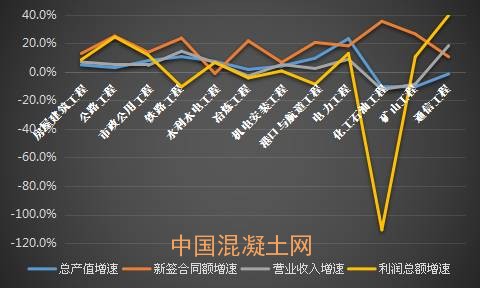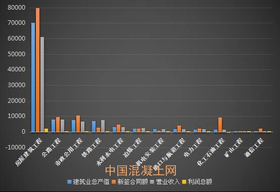 房建、公路、市政公用、鐵路工程四大專業類別在建筑總產值、營業收入、利潤總額三項指標上穩居前四,且占全部比重達85%以上,不過從新簽合同額上指標上看,鐵路工程相對落后。