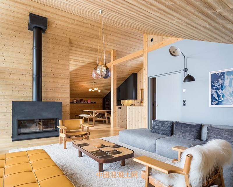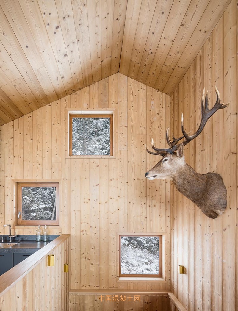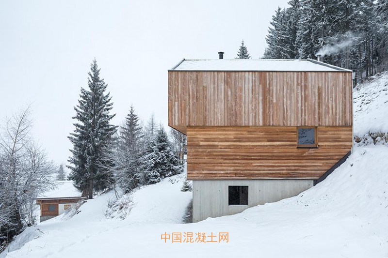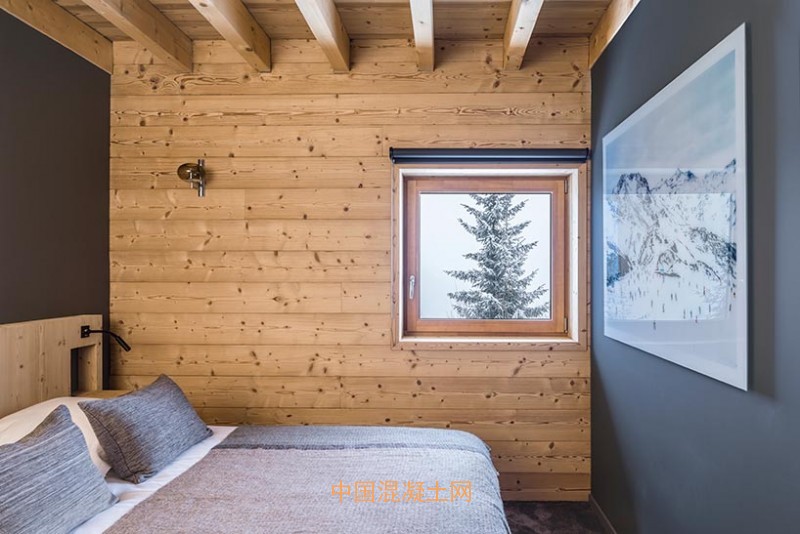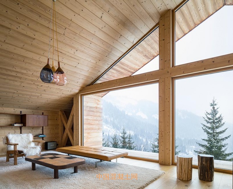 現代化的方法最顯著的使用便是采用混凝土和木材的組合,旨在打破該區域的局限性和墨守成規的美觀性。因此,山屋捕捉并增強了山坡的內在素質,突出了支撐在混凝土基礎上的特殊的木質架構。入口是從混凝土的地基中延伸出來的,內部遵循了臥室和公共區域的木材表現。在客廳里,大玻璃窗跨越頂層,將外面的積雪覆蓋的景觀展現的淋漓盡致。