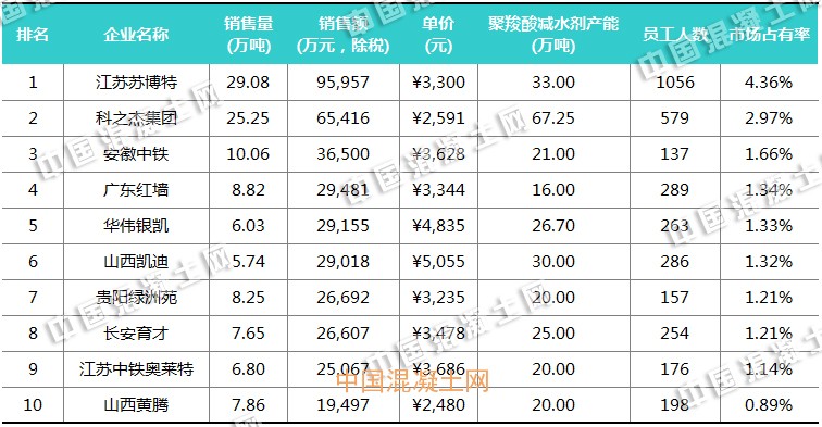 此次評選出的外加劑企業綜合十強是由中國混凝土網經多方調查統計,搜集了國內大型重點外加劑企業的銷售收入、企業規模等數據,以2016年各企業實際銷售額為依據,經過對各項數據的權重比較得出最終排名。江蘇蘇博特、科之杰集團連續多年蟬聯冠亞軍寶座,廣東紅墻、長安育才、安徽中鐵、貴陽綠洲苑、廣東瑞安、華偉銀凱、山西凱迪和深圳五山分列第三至第十名。