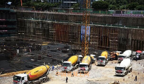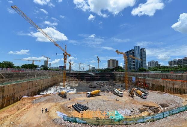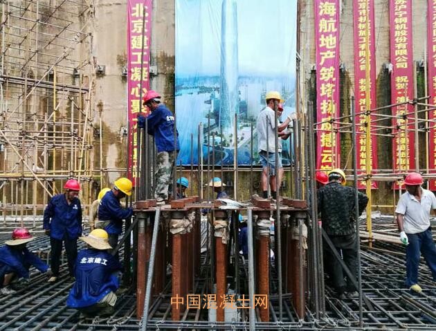 7月9日,由北京建工集團施工的428米的海南第一高樓——??陔p子塔?南塔工程塔樓筏板基礎單次9.6萬噸近4萬方混凝土澆筑施工任務拉開序幕。下午13時36分,海航地產總裁楊猛先生一聲令下,第一車混凝土通過溜槽奔馳而下,??陔p子塔?南塔大體積混凝土澆筑正式開始,全球六大傳媒集團之一Havas、央視9頻道、鳳凰網等多家媒體親臨現場實況轉播報道這項“超級工程”。