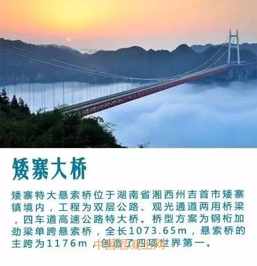 除此之外,中國還有世界最大跨度公鐵懸索橋——五峰山長江特大橋,荷載和設計時速世界第一;世界最長高鐵橋——丹昆特大橋,全長164.85公里;還有創下七項“世界第一”的赤石大橋、創下四項“世界之最”的湖南矮寨大橋等等。