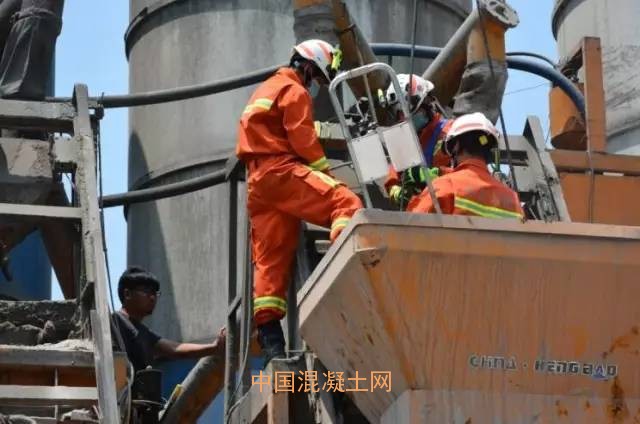 10時56分,救援人員到達現場,經詢問現場群眾了解到,被困人員在不打招呼的情況下進入攪拌機里面進行清理,后面的工友在不知攪拌機里有人的情況下啟動了攪拌機,導致該工人被困在罐體內,下半身已已經失去知覺不能動彈,被困位置又處于高空,空間狹小,給施救工作帶來很大困難。在了解情況后,救援人員迅速穿上防墜落裝備,從攪拌機上方將人救出。