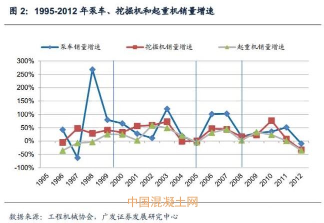 混凝土機械產品是曾經增速最快的產品。2000年以后,在《散裝水泥發展“十·五”規劃》、《關于限期禁止在城市城區現場攪拌混凝土的通知》以及2004年建設部等六部委下達的“十·五”期間在全國145個地級市推廣商品混凝土的文件等政策推動下,商品混凝土從一、二線城市逐漸進入三、四線城市,從而帶動了國內混凝土機械領域的空前發展。以混凝土機械領域的主要產品泵車為例,2002-2011年的十年間,泵車銷量增速水平整體上快于挖掘機和起重機,個別年份(2003年、2006年和2007年)增速超過100%,2011年在基數比較大的情況下實現了51%的增長。