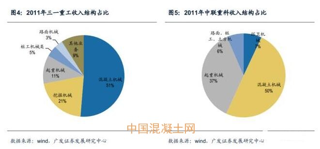 混凝土機械是中國工程機械領域最早達到世界領先水平的產品類別,特別是在國內企業成功收購世界混凝土機械三大巨頭后,中國企業已經占據了全球混凝土機械的制高點,其中中聯重科和三一重工是該領域排名領先的龍頭企業。2011年混凝土機械以1053億元的市場規模位列國內工程機械行業之首,占工程機械行業總收入的五分之一左右。