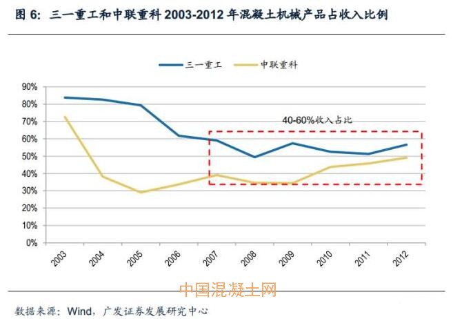 混凝土產品是曾經工程機械行業業務占比最大的產品。2011年混凝土機械以近1000億的市場規模位列國內工程機械行業之首。以混凝土機械的龍頭企業三一重工和中聯重科為例,兩家企業2007-2012年混凝土機械產品占總營收比重基本穩定在40%-60%的較高水平,一直是工程機械企業中比較核心的業務板塊。三一重工2003-2006年混凝土機械收入占比均在60%以上,個別年份占比高于80%。