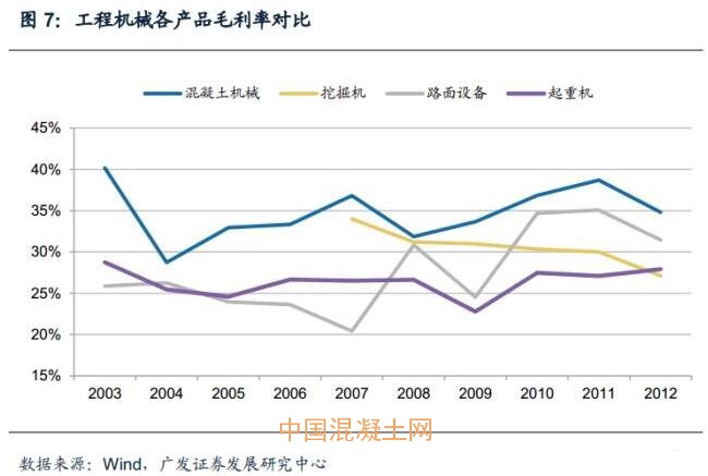 混凝土產品是曾經盈利能力最強的產品。2003-2013年,國內企業混凝土機械產品毛利率基本保持在30%以上,持續高于挖掘機等其他類型的工程機械產品。同時期行業龍頭三一重工和中聯重科混凝土機械毛利率則基本保持在40%以上。2011年中聯重科和三一重工的混凝土機械毛利率水平分別為36%和42%。除此外,混凝土機械產品曾經是各個制造企業的利潤中心,根據我們測算,2003-2013年三一重工的混凝土機械產品對公司凈利潤的貢獻保持在40%以上。