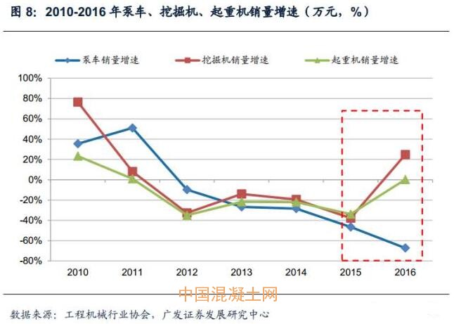 3)環保政策的強化。為貫徹《中華人民共和國大氣污染防治法》,嚴格控制機動車污染,全面實施《輕型汽車污染物排放限值及測量方法(中國五階段)》中規定的國五標準,自2017年7月起,不再生產和銷售非國五標準的重型柴油車。對工程機械領域的攪拌車、泵車和車載泵等都有積極的影響。目前存量的工程機械設備,包括混凝土機械設備,主要都是國二和國三標準的,排放污染較大。隨著環保法規執行越來越嚴格,未來具備較大的可替換空間。