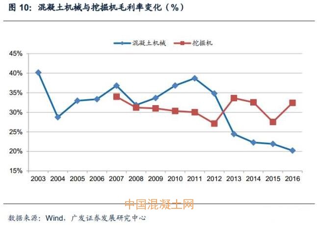 (2)毛利率不斷下降。2012年以后,混凝土機械利潤率從之前30%-40%的高水平不斷下降,2016年的毛利率僅為20%,相比峰值水平下降了近一半。與此同時,挖掘機的毛利率水平則呈現不斷上升趨勢。
