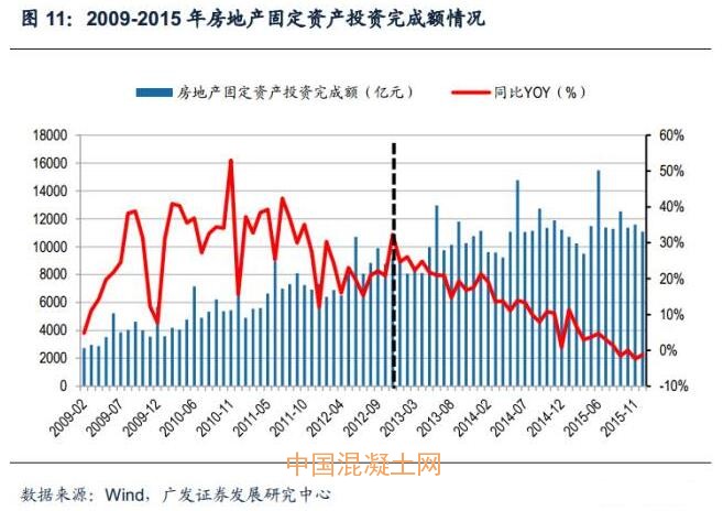 房地產投資市場下滑。混凝土機械需求主要來源于房地產市場,如果房地產項目驟然降溫,混凝土機械市場就損失大量的集群客戶,市場需求趨向零碎化。2010-2011年,各地相繼推出嚴格的房地產限購政策。而2013年四季度以來信貸政策的收緊,增加了開發商融資的難度,房地產開發投資受到進一步的抑制。受緊縮政策影響,房地產新開工面積同比增速從2009年底的峰值下降到底部區域震蕩,2013年四季度以來,更呈現底部區域不斷下降的趨勢。房地產固定投資完成額同比增速則自2013年以來呈直線下降趨勢,從2009-2012年30%的中樞水平,下降到2015年底的-1.2%。