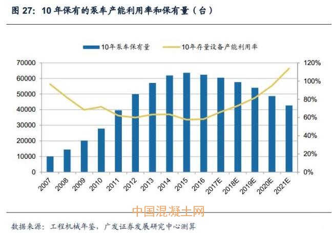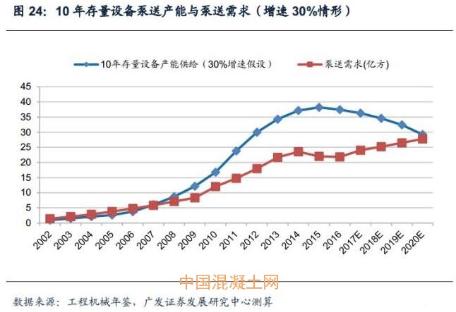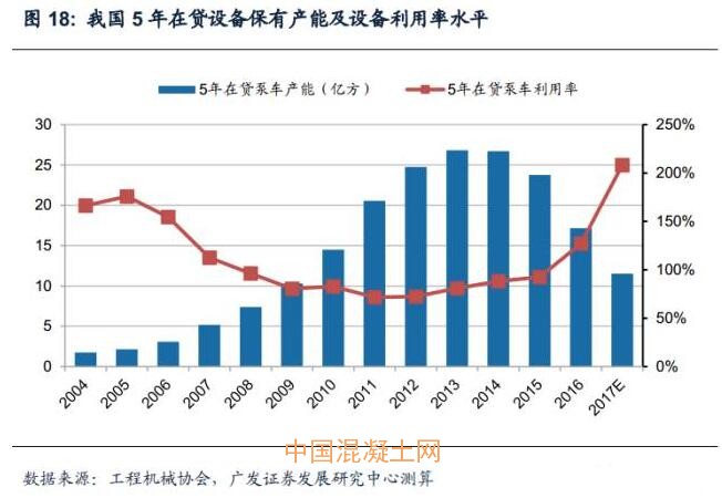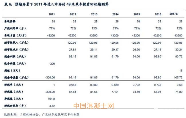 高峰期積壓的存量設備,將會在2017-2018年逐步消化完成。以典型案例分析,如果在前期階段高點2011年進入市場的新設備,參考2011年的泵送價格和產能利用率(全社會均衡產能利用率為72%)基礎,預期的折現回收期約為3.7年。但是, 真實情況卻是,由于行業產能供給過剩,從2013年開始泵送價格和泵送量都不同程度下滑,相應的,投資回收周期由預期的3.7年拉長至5.7年,因此2011-2012年左右高位進入市場的設備在最近幾年的開工率水平下,將會在2017-2018年逐步消化完成。