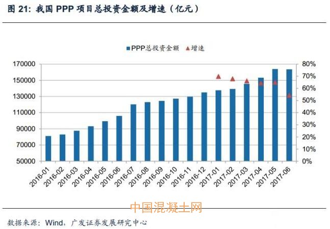 1)基建項目的重啟。2017年以來,基礎設施建設項目投資增速持續增長,2017年上半年保持在11%左右,略超2016年的水平。2016年下半年以來,PPP模式興起,一大批PPP項目的逐步落地,包括交通運輸、水利建設、市政工程、片區開發、政府基建、保障安居工程等項目,根據Wind數據顯示,上述領域的PPP項目占PPP項目投資金額的比例達到82%。
