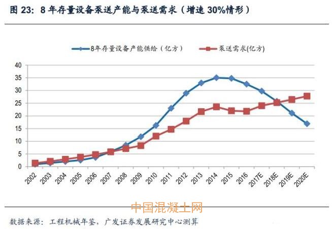 1)8年設備保有期限。與前文相似,如果考慮未來幾年新車銷量在30%左右增幅(中性假設),并且存量設備8年更新,單臺泵車年泵送6萬方左右形成有效產能,則供需平衡點出現在2018年。2018年后,會逐步進入供不應求的階段。