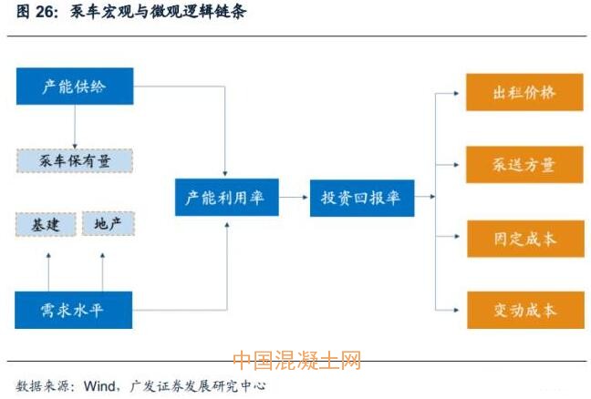以泵車為例,在我們的分析框架中,產能利用率是非常重要的指標,也是行業景氣度的風向標之一。產能利用率由產能供給和真實的需求水平決定,而產能利用率又決定了整體的投資回報率水平,投資回報率水平的幾個重要變量分別是出租價格、泵送方量(工作量)、經營成本和費用(固定成本和變動成本)。