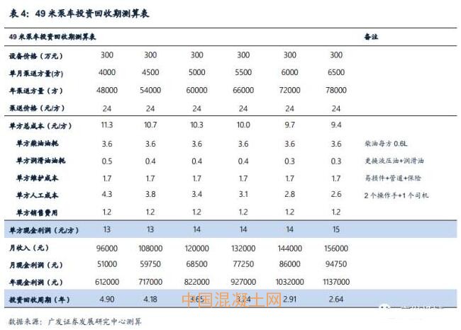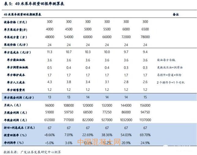 產能利用率提升帶來投資回收周期縮短。存量設備產能利用率提升,帶來的直接結果是設備購買者投資回收周期縮短。我們以49米泵車作為測算案例,當泵送價格穩定在24元/方時,如果年泵送方量從48000方到78000方變動,投資回收周期則從4.9年下滑到2.6年。通常來看,49米泵車當前的工作量約為5000方/月,1年6萬方的產出效率,單方總成本約為10.3元,單方現金利潤為13.7元,投資回報率約為3.65年。