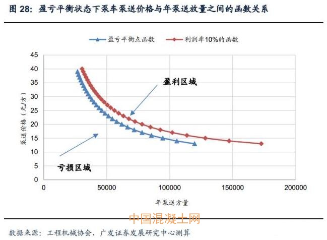 近期,由于供需關系的恢復,部分18-20元/方的地區價格有所上升,普遍調整了3-5元,目前國內大部分地區49米泵車的價格維持在23-25元/方。從泵送量來看,大部分存量泵車的月泵送水平是超過5000方的,根據我們的函數關系,每個月超過5000方,則利潤率水平會超過10%。