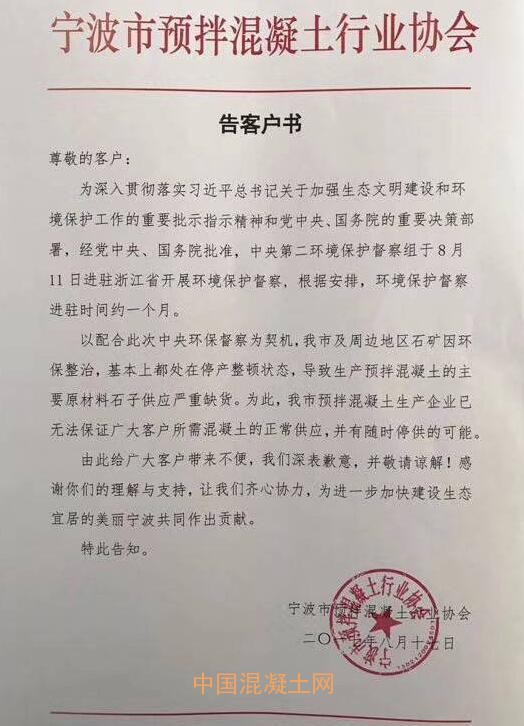 而就在環保督察組進駐一周的時間,寧波市預拌混凝土行業協會發布《發客戶書》,稱為配合環保督查為契機,寧波市及周邊地區石礦因環保整治,基本都處于停產整頓狀態,導致生產預拌混凝土的主要原材料石子供應嚴重缺貨。為此,寧波市預拌混凝土生產企業無法保證混凝土的正常供應,并有隨時停供的可能!