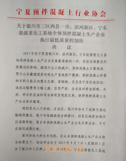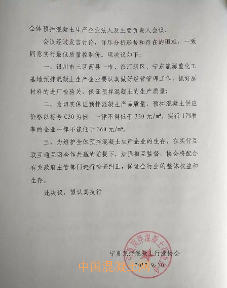 面對如此大的生存危機,寧夏混凝土協(xié)會于9月7日召開了銀川市三區(qū)兩縣一市、濱河新區(qū)、寧東能源重化工基地全體預(yù)拌混凝土生產(chǎn)企業(yè)法人及主要負(fù)責(zé)人會議。會議一致同意實行最低質(zhì)量控制價。預(yù)拌混凝土供應(yīng)價格以標(biāo)號C30為例,一律不得低于330元/方,實行17%稅率的企業(yè)一律不能低于360元/方,以切實保證當(dāng)?shù)仡A(yù)拌混凝土質(zhì)量。