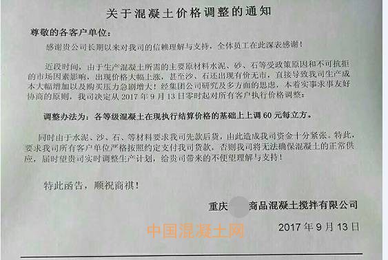 9月12日重慶主城區水泥價格上調60元/噸,13日部分商混企業發函上調混凝土價格60元/方(調價函如下圖)。