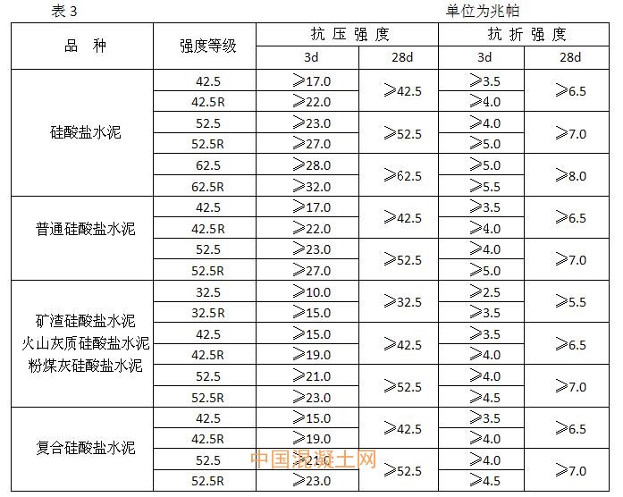 2、表3更改為新表:不同品種不同強度等級的通用硅酸鹽水泥,其不同齡期的強度應符合表3的規(guī)定。