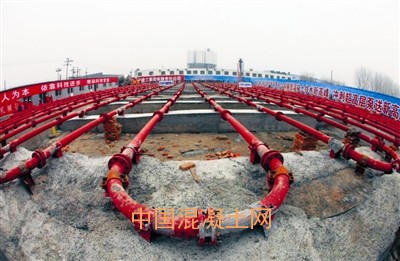但是C60高標號自密實超大混凝土底板澆筑,卻從未有人有過在自然條件下的實際澆筑經驗,新型建材公司關于緩凝的實驗設想都是在“摸石頭過河”。但目前,新型建材公司已經成功將C60自密實混凝土超大底板一次性澆筑付諸實踐,在國內最大一次性澆筑底板澆筑任務中一顯身手。