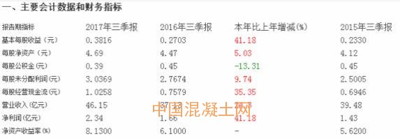 10月28日,萬年青發布2017年三季報,報告期內,公司實現營業收入46.15億元,同比增長24.30%;凈利潤為2.34億元,同比增長41.176%;每股收益為0.38元。