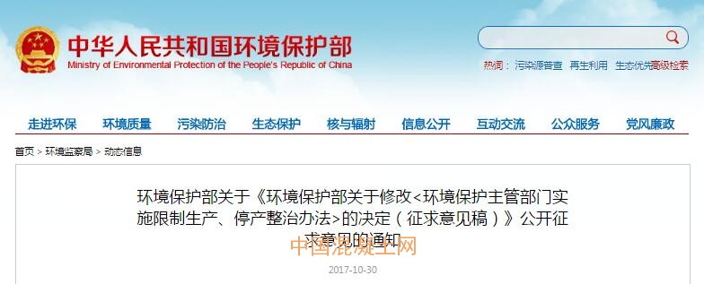 10月30日,環保部就《環境保護部關于修改<環境保護主管部門實施限制生產、停產整治辦法>的決定(征求意見稿)》在中國政府法制網、環保部官網公開征求意見,征求意見為期一個月,截止時間為2017年11月30日。其中涉及部分輕微違法情形的規定將停產整治的期限設為三個月。