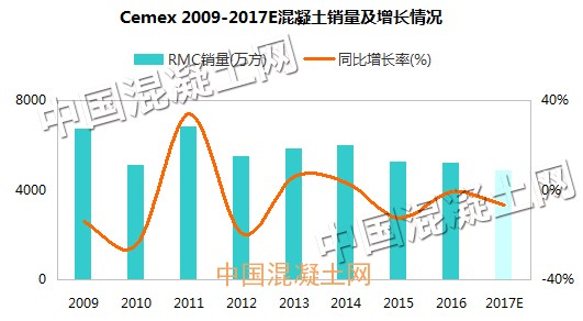 2016年,Cemex實現凈銷售額134億美元,同比前一年的137.9億美元下降3%,EBITDA(稅息折舊及攤銷前利潤)同比上漲6%至27億美元。水泥銷量9300萬噸,占公司總收入的45%;混凝土銷量5200萬立方米,占公司總收入39%;骨料銷量1.51億噸,占公司總收入16%。目前,Cemex在全球共有1555個預拌混凝土廠和305個骨料采石場。