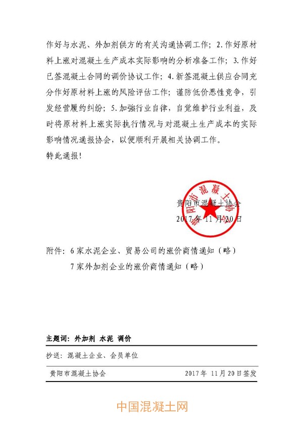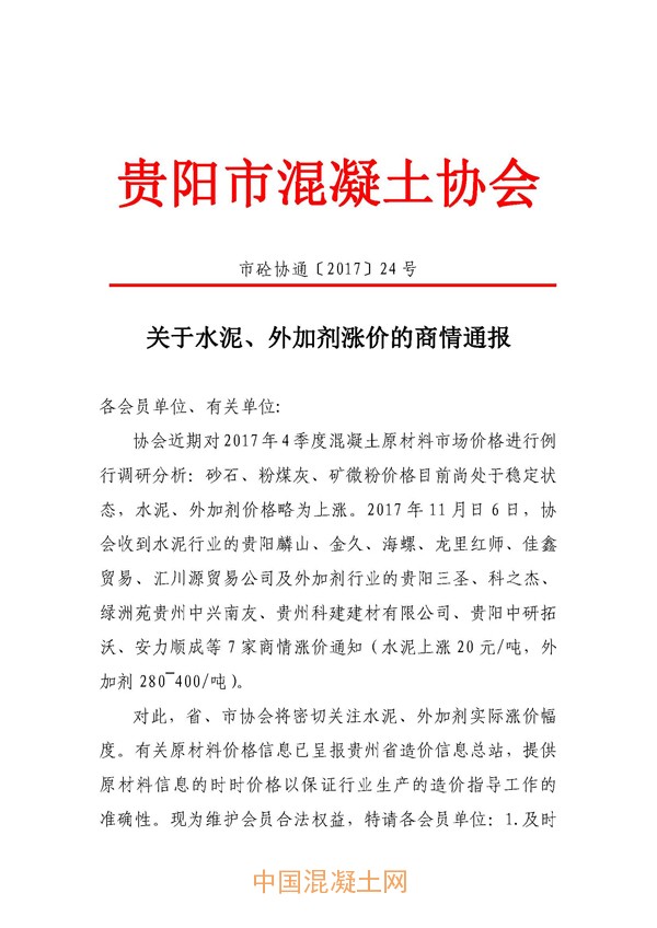 2017年11月6日,協會收到水泥行業(yè)的貴陽麟山、金久、海螺、龍里紅師、佳鑫貿易、匯川源貿易公司及外加劑行業(yè)的貴陽三圣、科之杰、綠洲苑貴州中興南友、貴州科建建材有限公司、貴陽中研拓沃、安力順成等7家商情漲價通知(水泥上漲20元/噸,外加劑上漲280~400元/噸)。