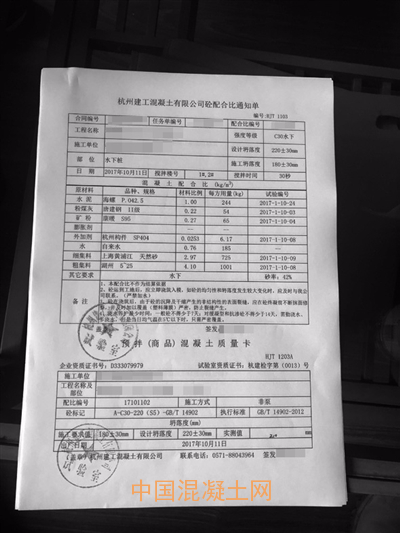 杭州建工混凝土有限公司銷售的混凝土會有“杭州建工混凝土有限公司砼配比通知單”、“預拌(商品)混凝土質量卡”、“預拌砼發貨單”