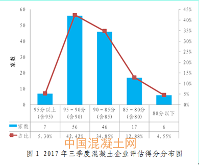本次評估檢查的132家混凝土企業平均分為89.07分,得分在80分以上(含80分)的企業有126家,占總數的95.45%。80分以下以及95分以上的企業較少,大部分企業得分分布在80-95分之間,尤其是90-95分這個區間,包含了56家企業,占總數的42.42%,具體得分分布見圖1。