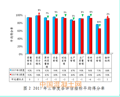 本季度由于指標體系的調整以及檢查內容的進一步細化,各指標體系平均得分率較上季度均有所下降。資質符合情況、質量管理體系、試驗室管理、資料管理、抽樣檢測方面得分率較高,尤其是抽樣檢測中試塊(拌合物)抽檢得分率達到98.06%。合同管理、生產管理以及原材料質量管理需進一步加強,具體情況見圖2。
