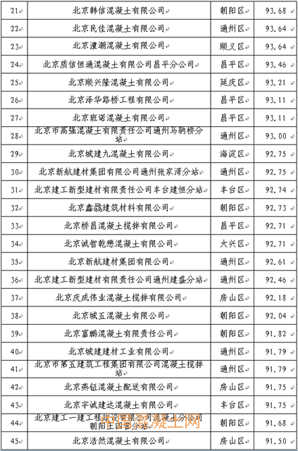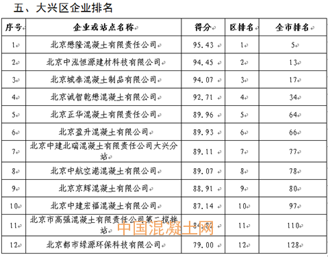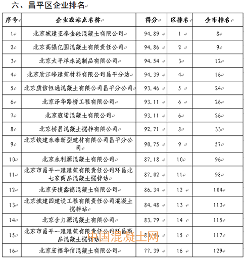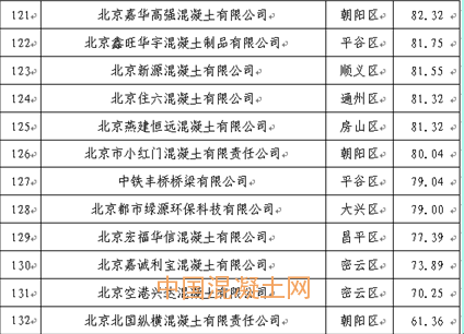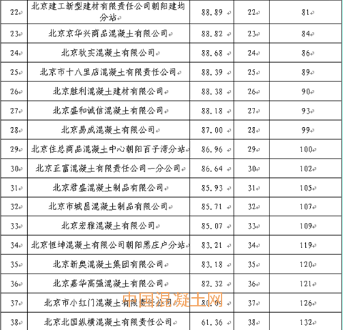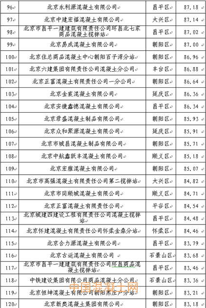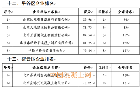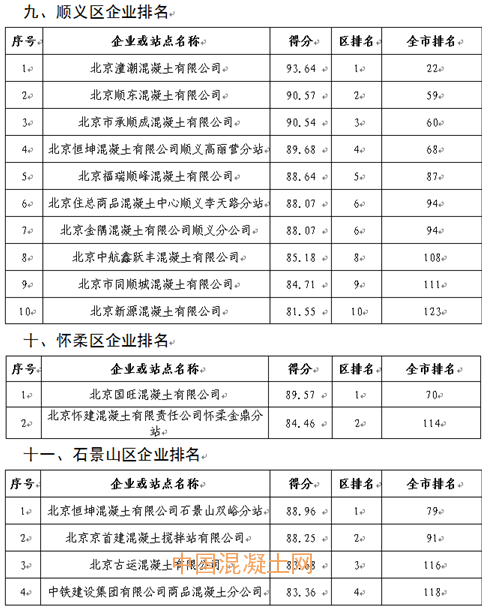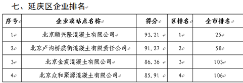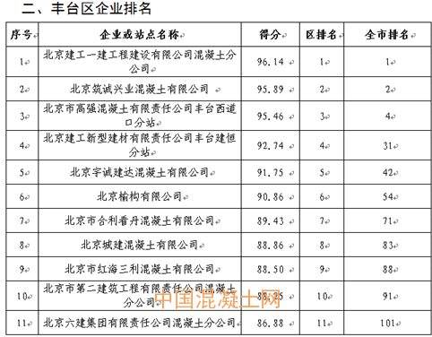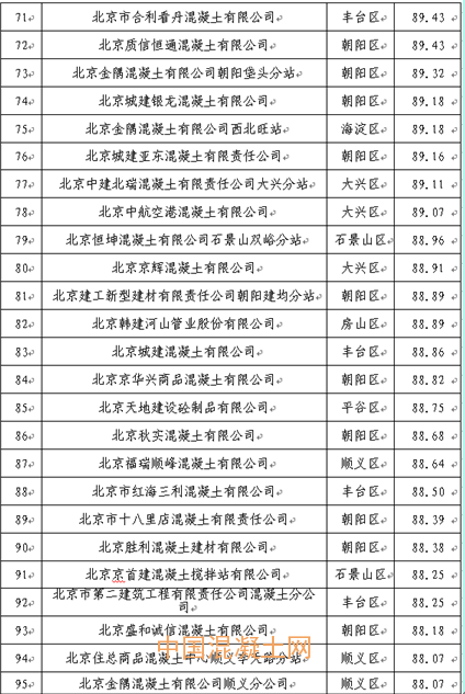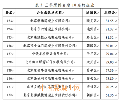本季度得分最高的企業為北京建工一建工程建設有限公司混凝土分公司96.14分,得分最低的企業為北京北國縱橫混凝土有限責任公司61.36分,全市混凝土企業得分排名詳見附件3。