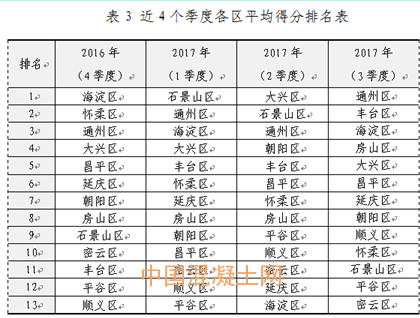 按132家混凝土企業所屬的13個轄區進行評估分析,三季度評估平均分前5名的區為:通州區、豐臺區、海淀區、房山區、大興區。其中通州區已連續4個季度排名全市前3名,大興區已連續4個季度排名全市前5名,延慶區本季度得分排名提升明顯。評估平均得分后3名的區為:石景山區、平谷區和密云區,其中平谷區和密云區已連續4個季度排名靠后(近4個季度各區平均得分排名見表3)。本季度各區企業得分排名見附件4。