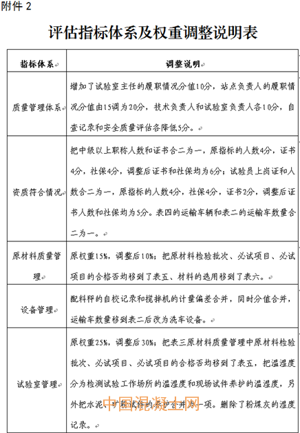 評估的主要內容分為質量管理體系、資質符合情況、原材料管理、設備管理、試驗室管理、生產管理、混凝土出廠質量管理、資料管理、合同管理以及抽樣檢測,共計10個方面。根據前三個季度的評估檢查情況,本季度起對評估指標體系進行調整,進一步加大對質量影響較大指標的分值權重,合并部分同類指標,調整后的10個方面包含一級指標48個,二級指標145個,三級指標278個,總分為100分,具體調整內容見附件2。