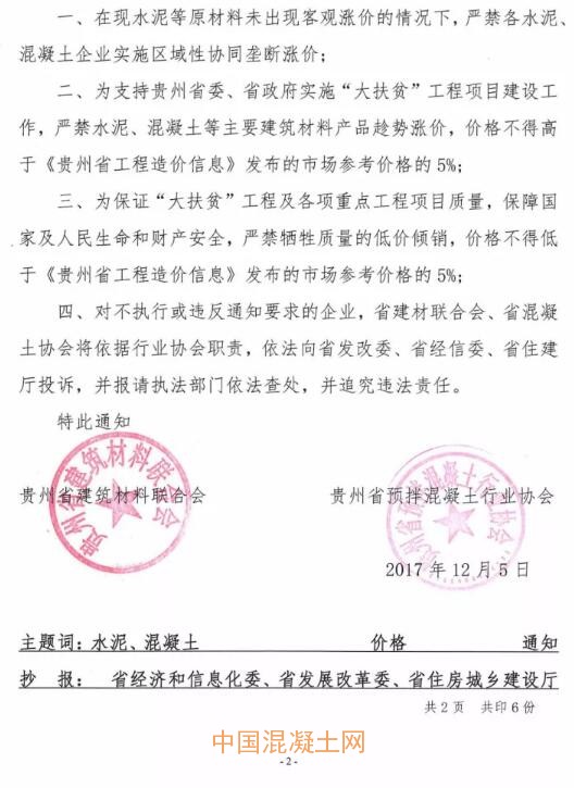 5日,貴州省預拌混凝土行業(yè)協(xié)會發(fā)文稱:為支持貴州省委、省政府實施“大扶貧”工程項目建設工作,嚴禁水泥、混凝土等主要建筑材料產(chǎn)品趨勢漲價,價格不得高于《貴州省工程造價信息》發(fā)布的市場參考價格的5%,對不執(zhí)行或違反通知要求的企業(yè),將依法查處,并追究違法責任。