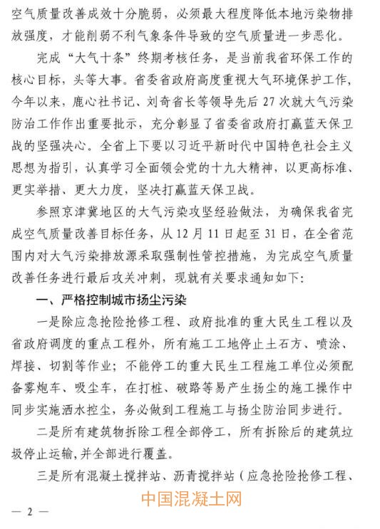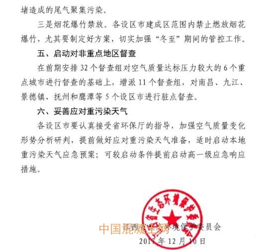 近日,江西省生態環境保護委員會發布《關于啟動大氣污染防治強制性攻關沖刺措施的緊急通知》,要求從12月11日至31日期間,采取大氣污染防治強制性管控措施,所有混凝土攪拌站、瀝青攪拌站(應急搶險搶修工程、政府批準的重大民生工程以及省政府調度的重點工程除外)全部停產。