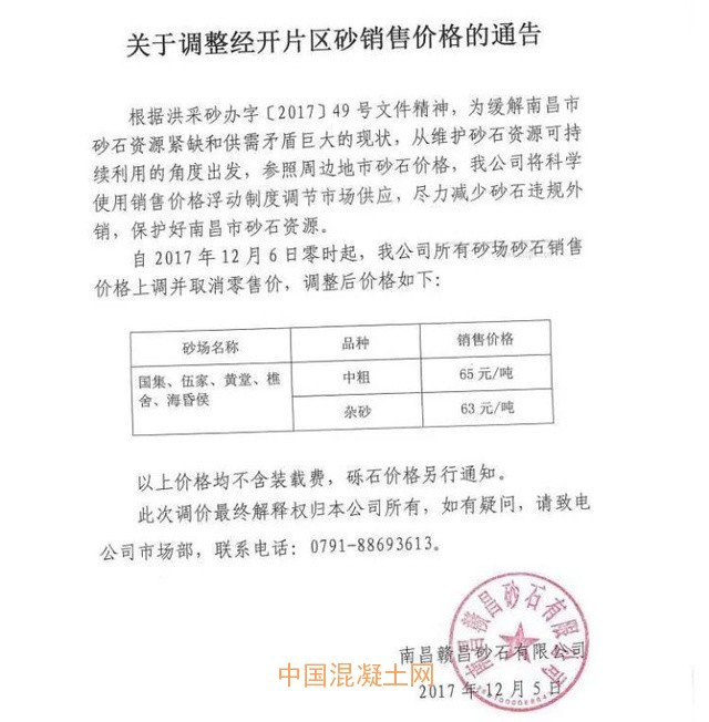 12月5日,贛昌砂石發布調價通告,對砂石市場價格進行了調整,其中,中粗砂65元/噸,雜砂63元/噸,并取消了零售價,南昌市其他使用單位可前往購買。
