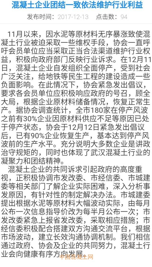 12月13日,武漢混凝土協會再度發聲,稱在協會發出倡議后(相關鏈接:武漢混凝土停產僅一日,協會發出恢復生產倡議書),目前90%混凝土企業已恢復生產,基本達到停產風波前的生產水平。