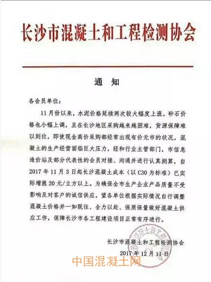 11月份以來,長沙地區(qū)水泥價格延續(xù)兩次較大幅度上漲,砂石價格也小幅上調(diào),且在長沙地區(qū)采購越來越困難,貨源保障難以到位,即使現(xiàn)金高價采購都經(jīng)常出現(xiàn)有價無市的狀況。長沙市混凝土和工程檢測協(xié)會11日發(fā)布通知,為確保全市混凝土生產(chǎn)企業(yè)產(chǎn)品質(zhì)量不受影響及對客戶的誠信供應,望各單位根據(jù)實際情況自行調(diào)整混凝土價格。