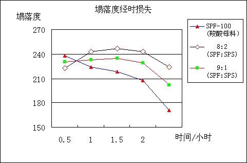例:見圖2。SPF-100(40%)聚羧酸減水劑與SPS-100質(zhì)量比,混凝土經(jīng)時(shí)損失圖。