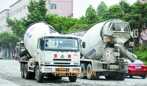 兩輛往來的混凝土攪拌車駛過富灣江灣社區大田村蓬山路,蓬山路路面破損嚴重。
