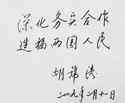 正在沙特訪問的中國國家主席胡錦濤,當地時間上午10時20分抵達中材集團旗下中材國際總承包建設的沙特利雅得水泥廠(RCC)參觀。胡主席詳細詢問了工廠的技術水平及生產情況,對中材集團的發展表示充分肯定,并勉勵中材“要繼續堅持科技創新,發揮自身優勢,擴大海外市場份額”。考察結束時,胡錦濤主席欣然為中材題詞:“深化務實合作,造福兩國人民。”